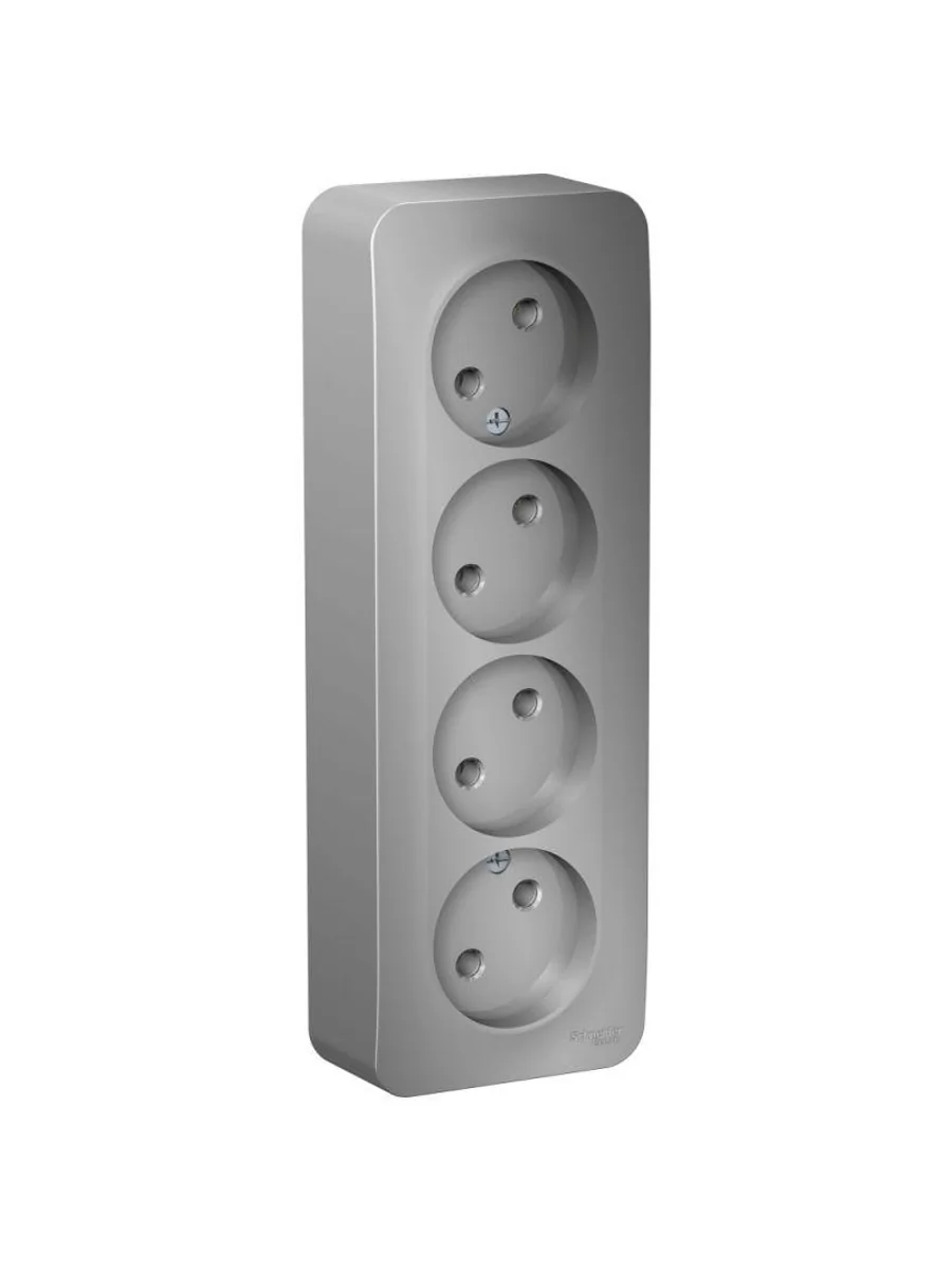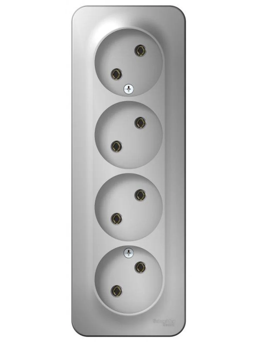 Розетка Systeme Electric (ранее Schneider Electric) BLANCA (алюминий, открытой установки) четырехместная, без шторок и заземления, с изолирующей пластиной предназначена для сетей до 250В, на ток до 16А. Четырехместная розетка позволяет подключить четыре устройства в одном месте. Она изготовлена из ABS-пластика, проста в установке и удобна в применении.