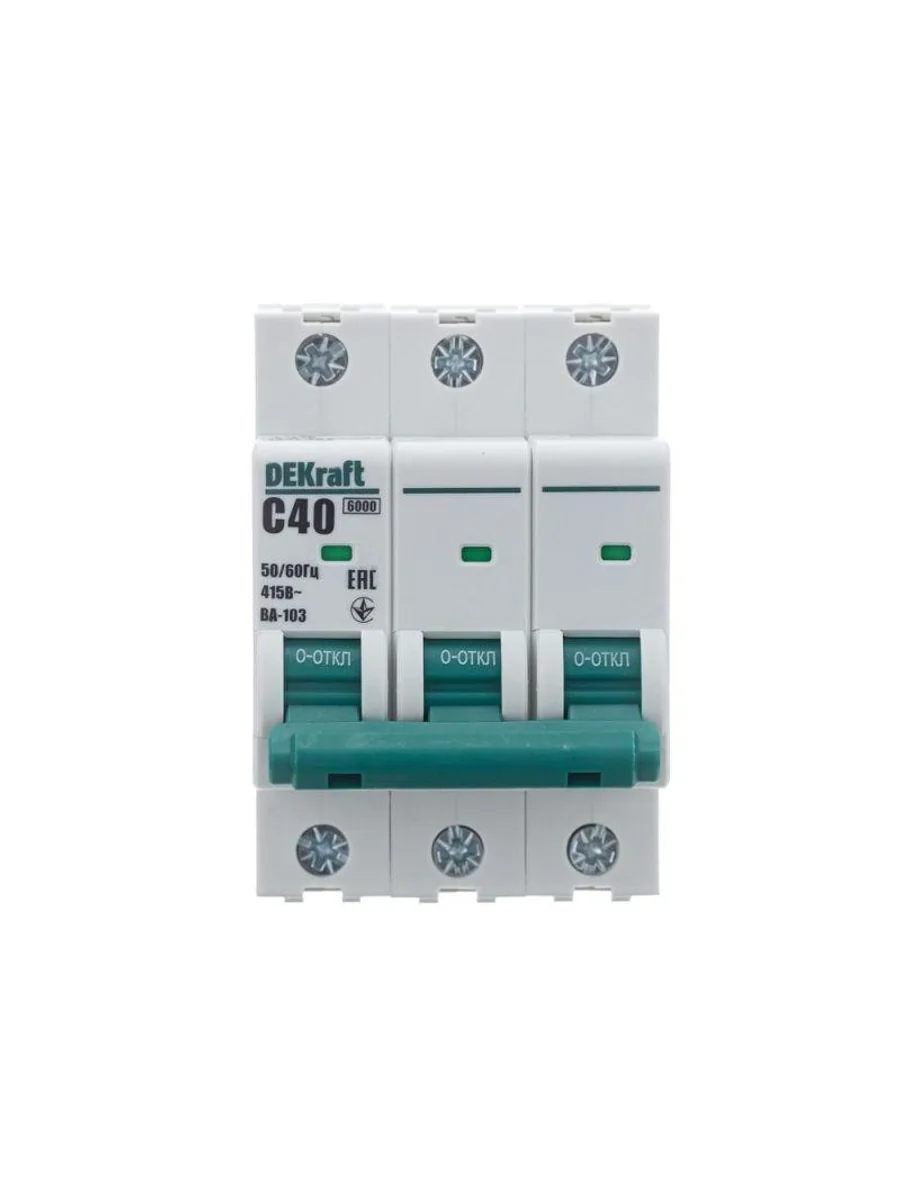 Автоматический выключатель серии ВА-103 NEW Dekraft; 3P; номинальный ток 40 А; характеристика C; отключающая способность 6 кА, что позволяет использовать аппараты в качестве вводных. 5 монолитных заклепок повышают прочность корпуса аппарата. Окошко-индикатор всегда показывает состояние контактов вне зависимости от положения рукоятки управления. Боковые каналы охлаждения повышают стабильность работы при высоких температурах окружающей среды. Есть возможность установки дополнительных аксессуаров с левой стороны устройства. Аппарат на 100% совместим с корпусами и оболочками Dekraft, Systeme Electric.