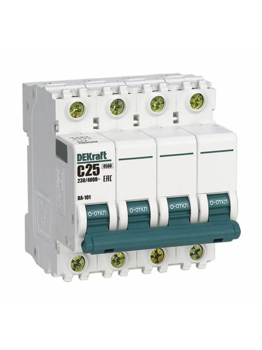 Автоматический выключатель серии ВА-101 Dekraft; 4P; номинальный ток 25 А; характеристика С; отключающая способность 4,5 кА. 5 монолитных заклепок повышают прочность корпуса аппарата. Сплошная лицевая панель обеспечивает безопасность эксплуатации аппарата. Боковые каналы охлаждения повышают стабильность работы при высоких температурах окружающей среды. Есть возможность установки дополнительных аксессуаров с левой стороны устройства. Аппарат на 100% совместим с корпусами Dekraft и Systeme Electric.