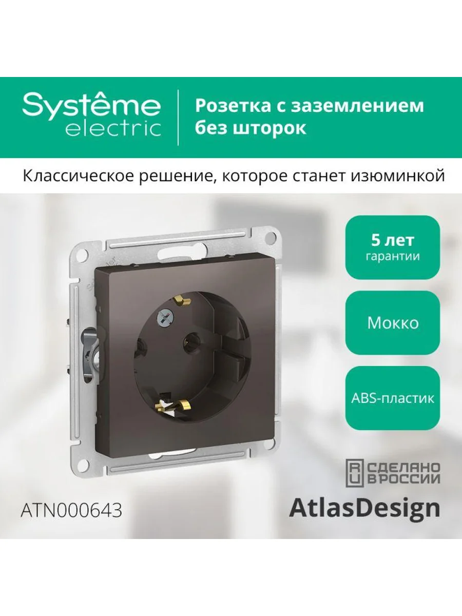 Механизм Systeme Electric (ранее Schneider Electric) серии AtlasDesign в цвете мокко розетки одинарной с заземлением и без шторок подходит для сетей 250 В, на ток 16 А. Заземляющий контакт обеспечивает дополнительную защиту от удара электрическим током. При наличии заземления электрический потенциал уходит в землю, защищая человека. Лицевые детали из качественного ABS-пластика, устойчивого к царапинам и УФ-излучению. Усиленные прямые монтажные лапки для лучшей фиксации механизма в монтажной коробке.