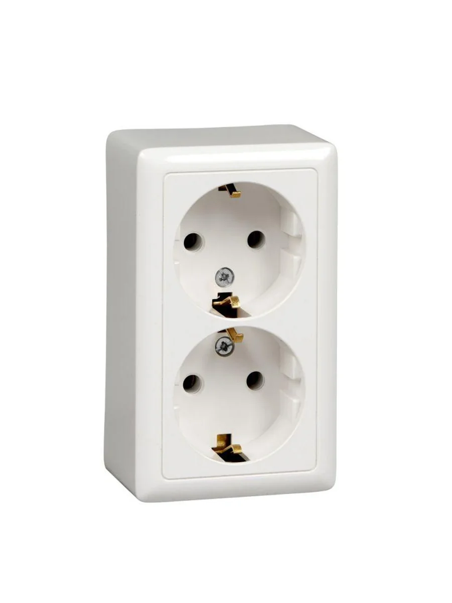Розетка Systeme Electric (ранее Schneider Electric) ХИТ (открытой установки, цвет белый) двойная с заземлением, без шторок с изолирующей пластиковой пластиной предназначена для сетей до 250 В на ток до 16 А. Двойная розетка позволяет подключить два устройства в одном месте. Заземляющий контакт обеспечивает дополнительную защиту от удара электрическим током. При наличии заземления электрический потенциал уходит в землю, защищая человека. Сделано в России.