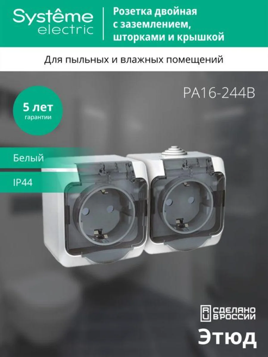 Розетка Systeme Electric (ранее Schneider Electric) ЭТЮД (белый, открытой установки) двухместная с заземлением и шторками предназначена для применения в сетях до 250В, на ток до 16А. Двухместная розетка позволяет подключить два устройства в одном месте. Шторки обеспечивают дополнительную безопасность. Розетка отлично подходит для ванной комнаты (IP44). Сделано в России.