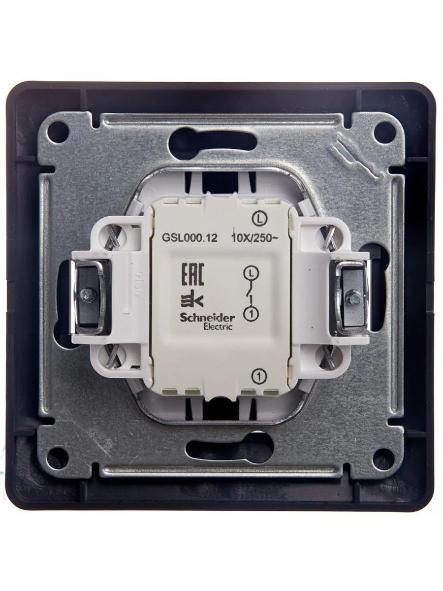 Выключатель Systeme Electric (ранее Schneider Electric) серии Glossa (в сборе, цвет графит) одноклавишный подходит для сетей 250 В, на ток 10 А. - Выполнен из материала PС+ASA, стойкого к УФ-излучению и появлению царапин. - Эргономичные клеммы расположены в два ряда: сверху и снизу.