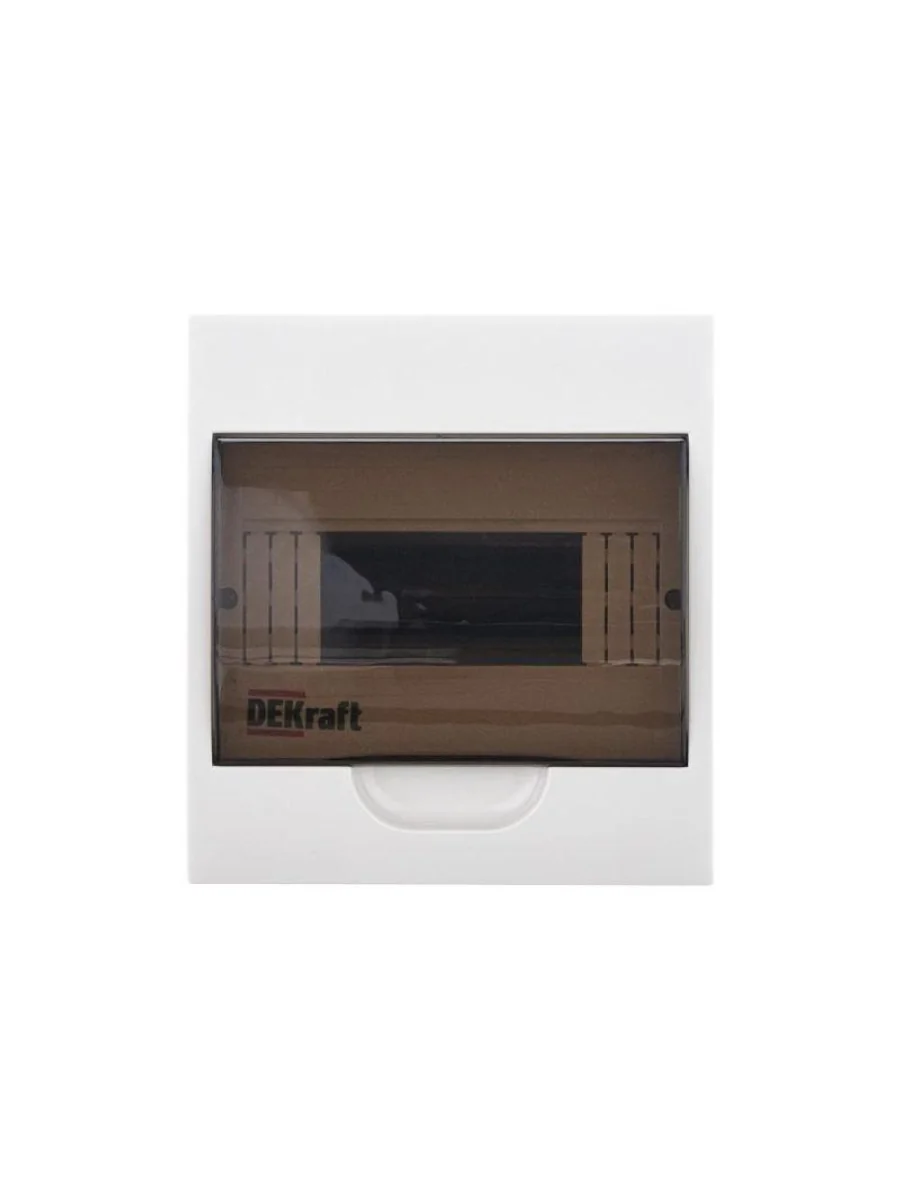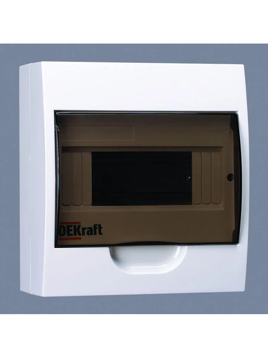 Корпус пластиковый навесной для электрических аппаратов серии ЩРН-П IP41 используют для установки в них модульной защитной аппаратуры. Дизайн корпуса имеет элегантные и скругленные формы, как и дверца, ее цвет темное органическое стекло. Фронтальные части корпуса, дверца, основание корпуса изготавливаются из самозатухающего ABS-пластика. Корпус имеет штампованные вводы для кабелей с разных сторон, и расстояния до точек крепления указаны сзади. Корпус является встраиваемым, имеет 1 черную DIN-рейку и 8 модулей (18 мм) для установки устройств, изолированный держатель для шинок, шинки N и PE. Дверца фиксируется в верхнем положении. Щиток на 100% совместим с модульным оборудованием Dekraft и Systeme Electric.