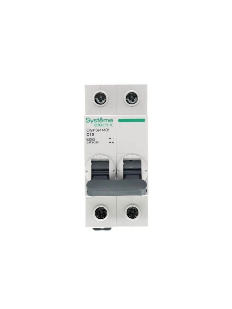 Автоматический выключатель серии City9 Set Systeme Electric, 2-полюсный, номинальный ток 10 А, характеристика С, Icn = 4.5 кА. Применяется в электрических сетях напряжением 230 В. Предназначен для защиты от перегрузок и токов короткого замыкания. Оснащен механизмом «мгновенной коммутации». Ударопрочный корпус из специального пластика с 6 металлическими заклепками. Безопасные клеммы исключают попадание кабелей в заклеммное пространство (ранее Schneider Electric EZ9F34210).