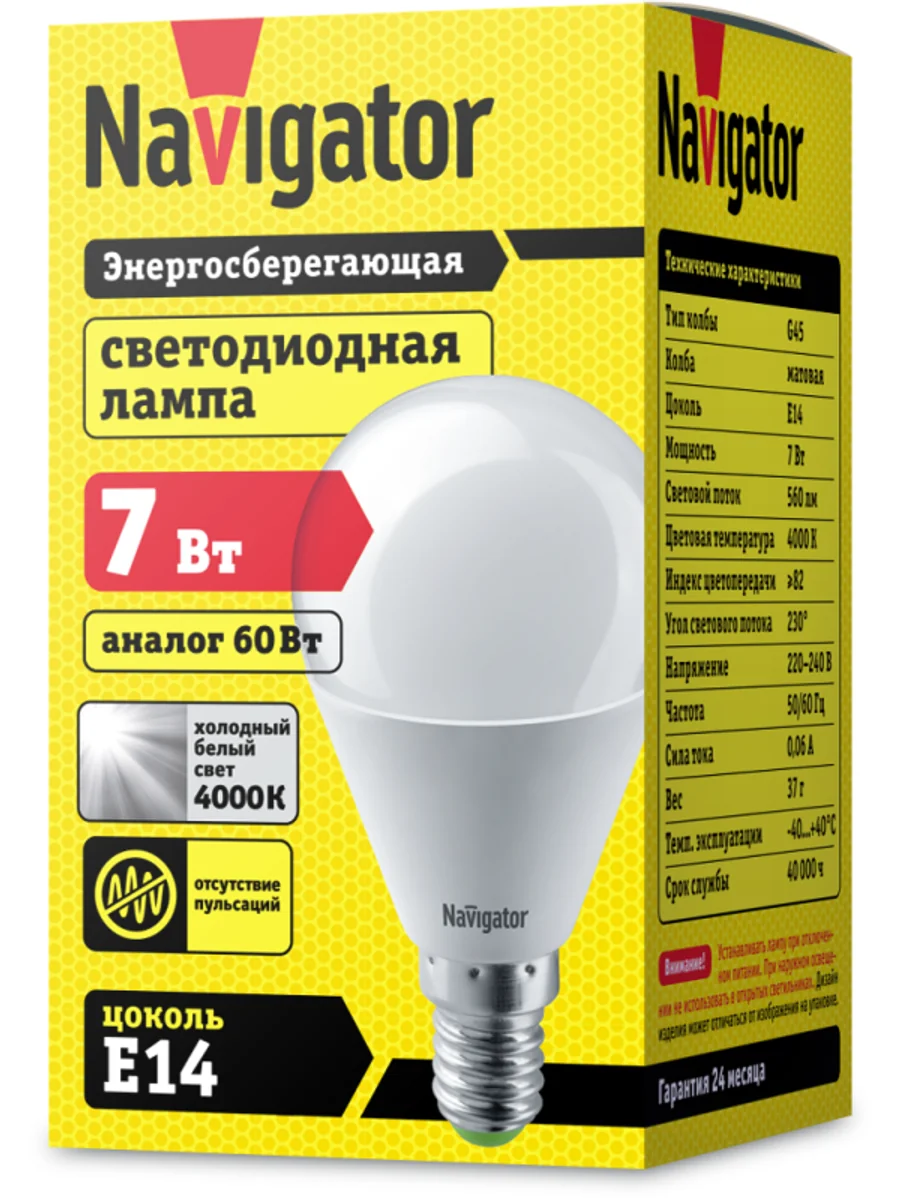 Лампа светодиодная 94 468 NLL-G45-7-230-4K-E14 Navigator 4607136944688 – лампа с колбой вида "шар", нейтрального белого света, длиной 78 мм, с цоколем Е14, мощностью 7 Вт. Цветовая температура 4000 К.