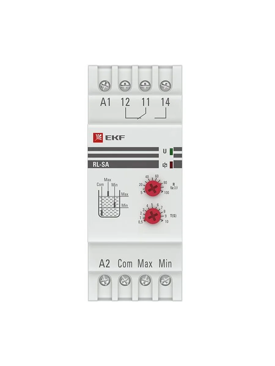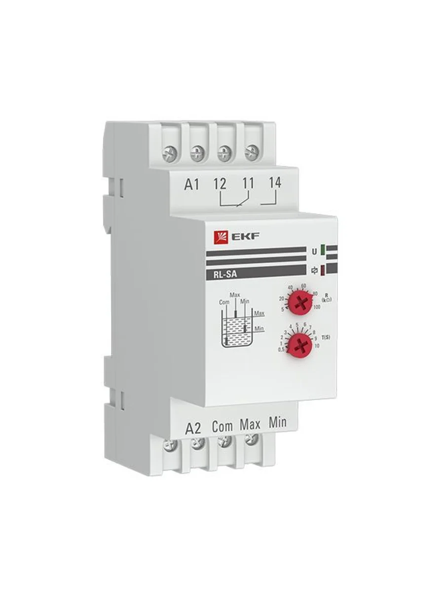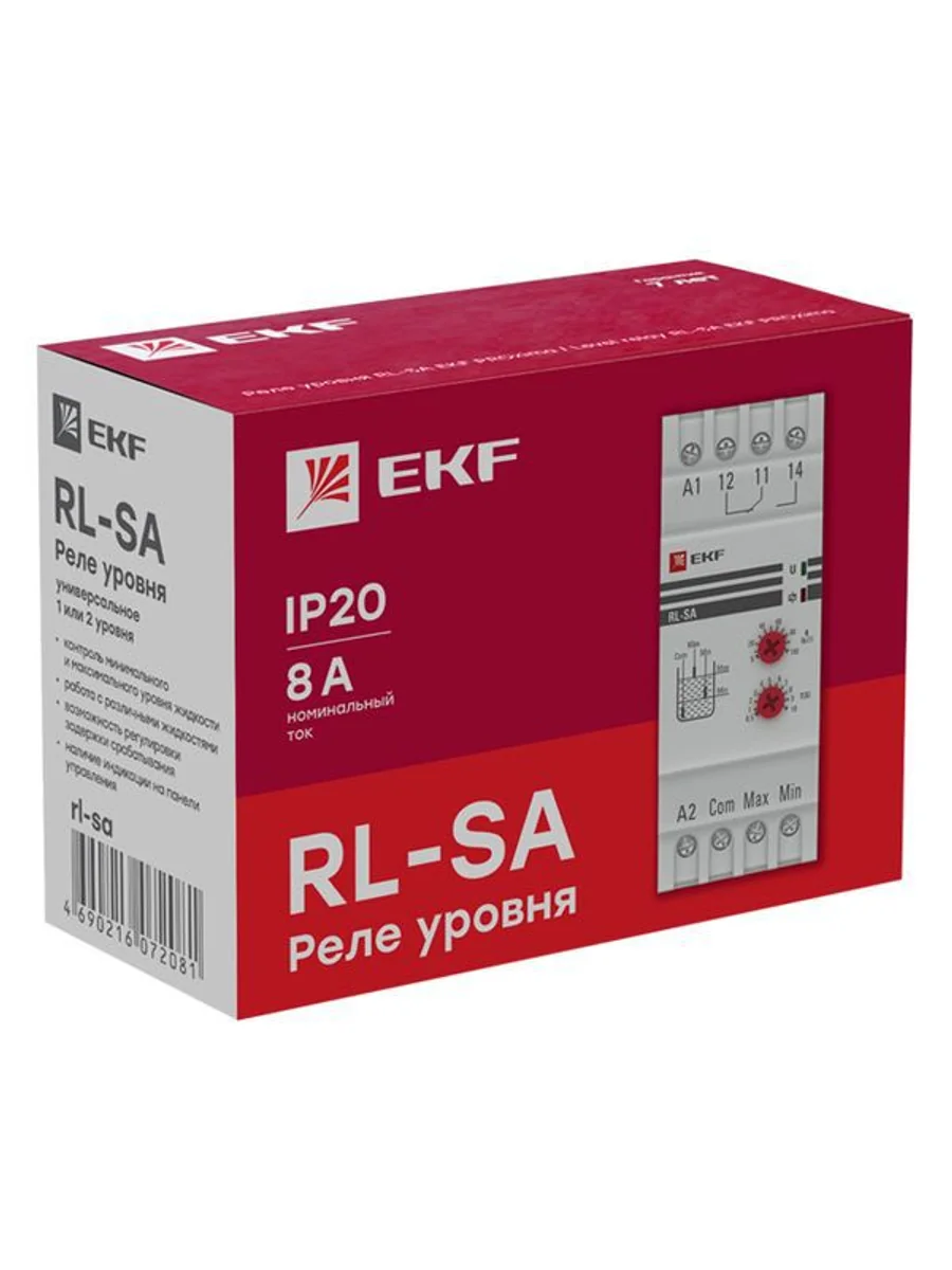 Реле уровня RL-SA EKF изготавливается на базе микроконтроллера и является электронным коммутационным устройством, предназначенным для контроля уровня жидкостей и управления электродвигателями насосов, как на заполнение, так и на слив жидкостей из ёмкостей с временной задержкой по выключению. Реле может управляться по двум или трём датчикам типа проводящих контактов. Также возможно применение датчиков EKF с выходом типа «сухой контакт» (датчики приобретаются отдельно). Реле нельзя использовать с легко воспламеняемыми или взрывоопасными жидкостями. Реле уровня соответствует ГОСТ 30804.4.4–2013 (IEC 61000–4–4:2004