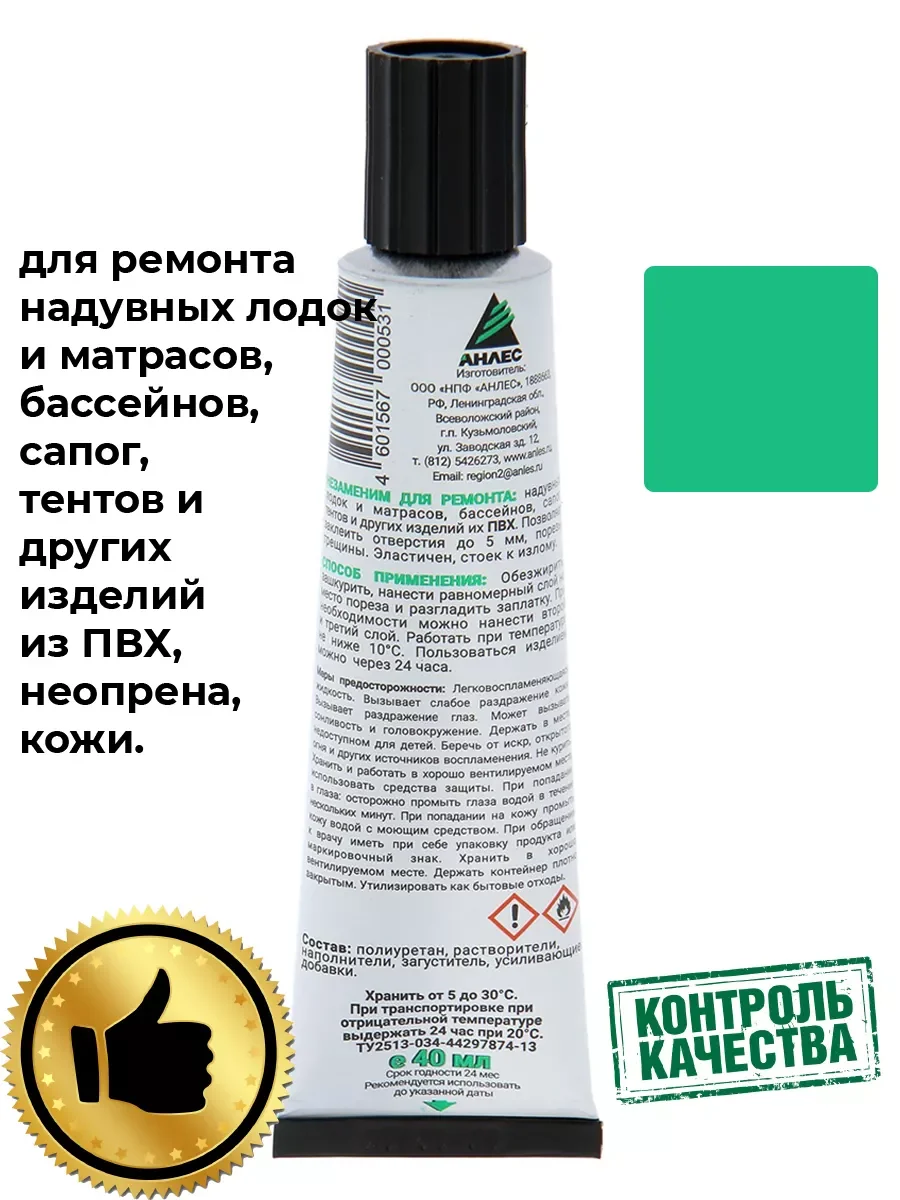 Клей Жидкая заплатка, зеленый. Незаменим для ремонта надувных лодок и матрасов, бассейнов, сапог, тентов и других изделий из ПВХ, неопрена, кожи. Позволяет заклеить отверстия до 5 мм , порезы, трещины. ЗапЛатка жидкая — Герметик (компаунд) на основе полиуретана.Однородная вязкая масса. Цвет: серый, черный, синий, зеленый, белый. Применение: Обезжирить, зашкурить, нанести равномерный слой на место пореза, при необходимости с обратной стороны можно приложить полиэтилен и разгладить заплатку. Работы проводить при температуре желательно выше 10оС, на спущенном (если надувное) изделии. Длинные разрезы можно предварительно сшить. Пользоваться отремонтированным изделием через 4 час, максимальная прочность достигается через 24 час. Позволяет заклеить отверстия до 5 мм , порезы, трещины.