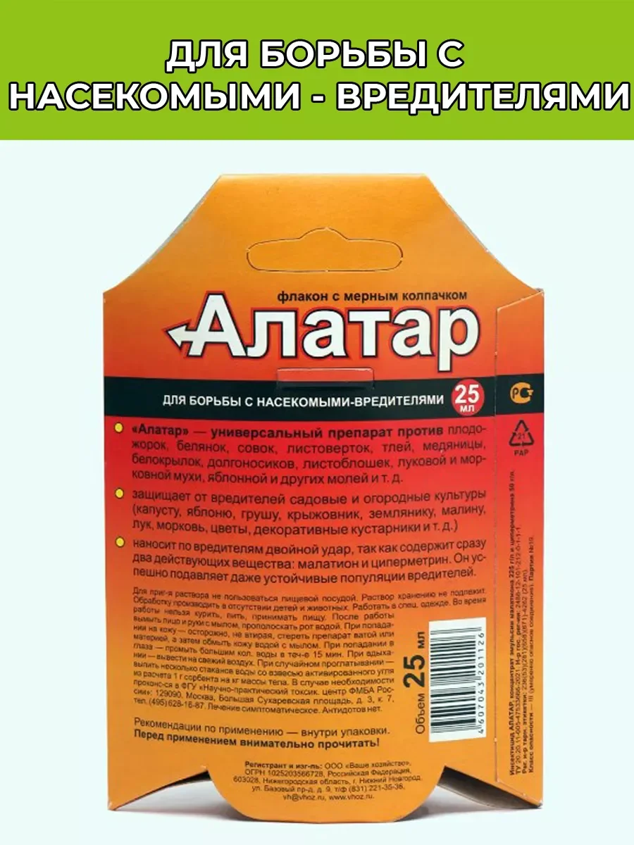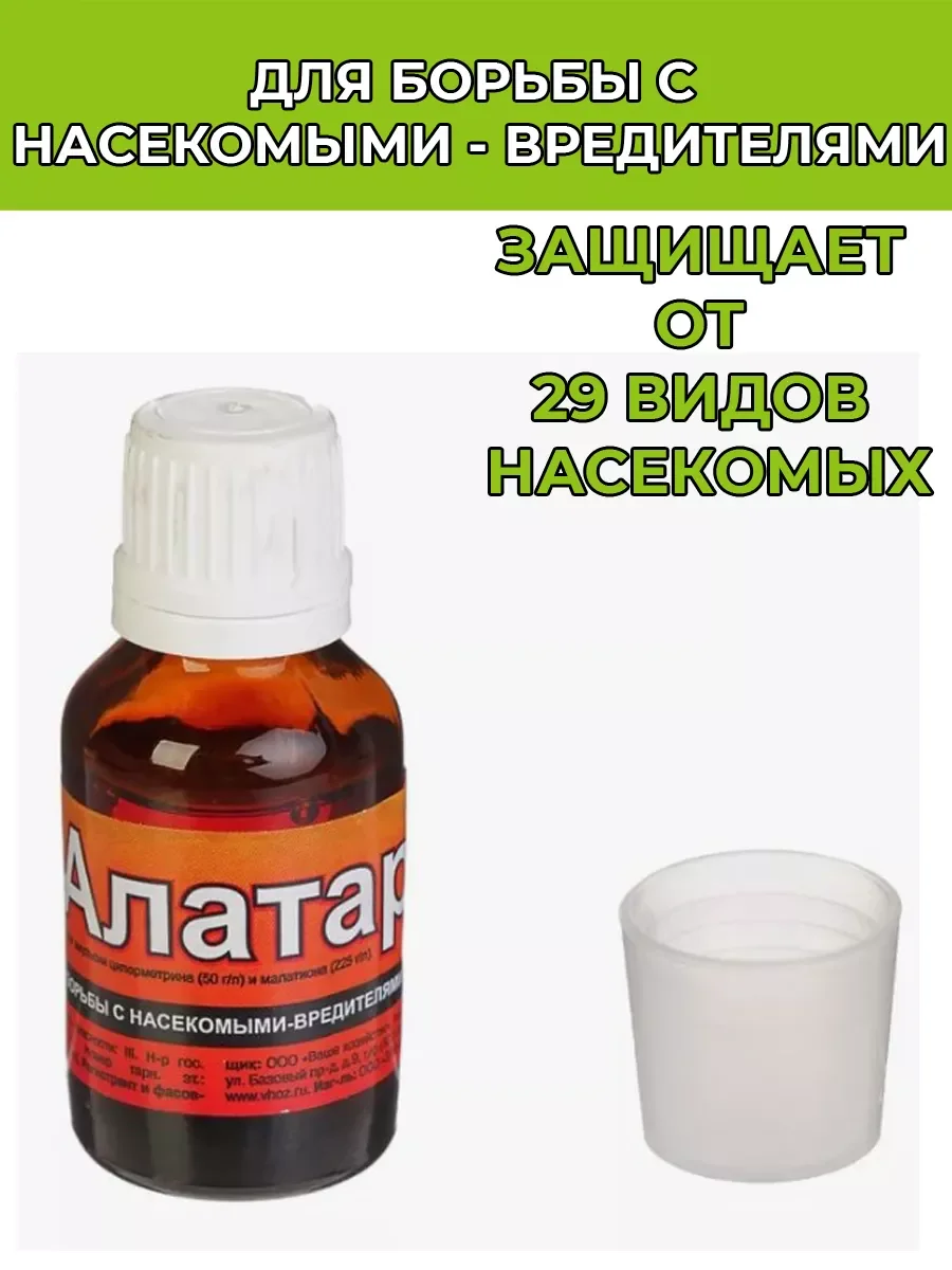 Алатар для борьбы с насекомыми, применяется весь сезон активного роста культур. Быстрый результат наступает благодаря действию сразу двух активных компонентов. Препарат устойчив к влаге и ультрафиолетовым лучам, защитит от вредителей садовых и огородных культур на вашем участке. Алатар наносит по вредителям двойной удар, так как содержит сразу два действующих вещества: малатион и циперметрин. Он успешно подавляет даже устойчивые популяции вредителей и обладает синергическим эффектом. Препарат имеет малую дозу расхода- 5 мл /10 литров воды на 1 сотку.