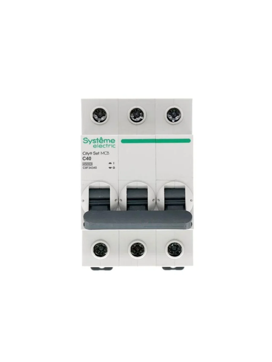 Автоматический выключатель серии City9 Set Systeme Electric, 3-полюсный, номинальный ток 40 А, характеристика С, Icn = 4.5 кА. Применяется в электрических сетях напряжением 400 В. Предназначен для защиты от перегрузок и токов короткого замыкания. Оснащен механизмом «мгновенной коммутации». Ударопрочный корпус из специального пластика с 6 металлическими заклепками. Безопасные клеммы исключают попадание кабелей в заклеммное пространство (ранее Schneider Electric EZ9F34340).