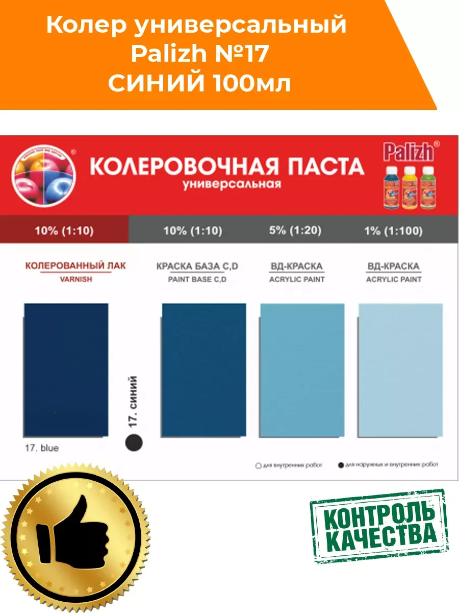 Универсальная колеровочная паста "Palizh" STANDART предназначена для колерования воднодисперсионных, алкидных (ПФ) лакокрасочных материалов: краски, лаки, эмали, шпатлевки, затирки, пропитки, грунтовки, штукатурки, гипсовые смеси. Не применять для колерования составов, содержащих масла и воски. Насыщенность цвета можно регулировать в процессе смешивания. Колеровка не изменяет первоначальных свойств краски (при соблюдении рекомендованного процента ввода). Для получения ярких оттенков используйте краски, эмали с обозначением База С ( D) или лаки. Храните в сухом помещении при температуре от +5 до + 30°С. Срок годности в невскрытой таре производителя - 36 мес. Допускается замораживание при транспортировке сроком не более 1 мес. Выдерживает 5 циклов заморозки/разморозки, после оттаивания и тщательного перемешивания сохраняет свои свойства. Совместим с ПФ-эмали, грунты, затирки для швов, краски акриловые (ВД), лаки акриловые (ВД), пропитки для дерева акриловые (ВД), шпатлевки акриловые/латексные (ВД), штукатурки декоративные. Тип работ: внутренние, наружные. Применение: