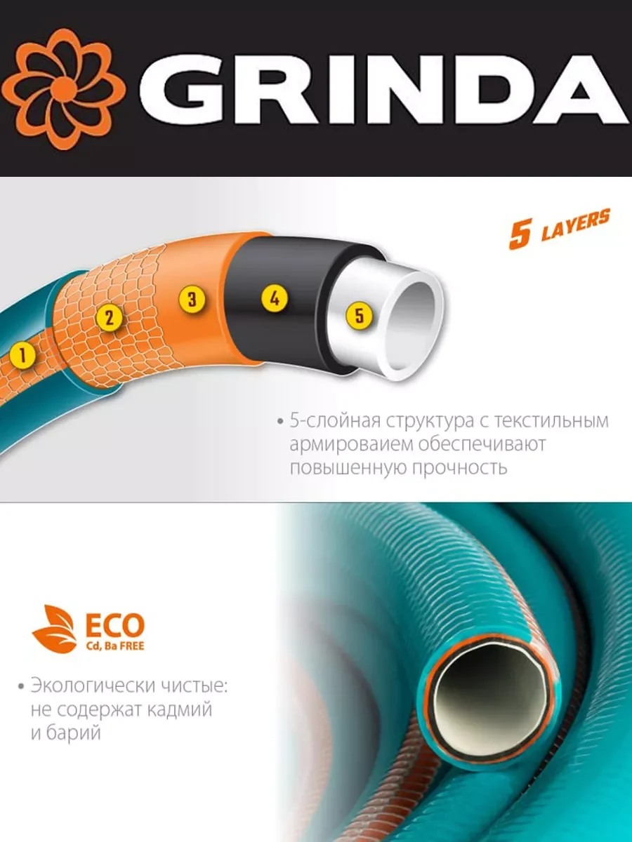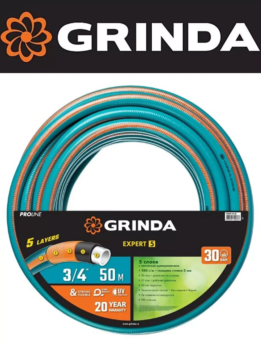 Поливочный шланг садовый пятислойный армированный GRINDA PROLine EXPERT 5 арт. 429007-3/4-50 - профессиональный шланг для поливочных работ на садово-огородном участке, отличающийся особой прочностью и надёжностью. Выполнен из пяти слоёв армированного полиамидными нитями ПВХ, который отличается устойчивостью к воздействию солнца, износостойкостью и не перекручивается при использовании. Сохраняет свою гибкость и эластичность в широчайшем температурном диапазоне. Не содержит кадмий и барий, безопасен для окружающей среды и человека. Внутренняя поверхность исключает возможность возникновения водорослей. Поверхность шланга не восприимчива к ультрафиолетовым лучам. Температурный диапазон хранения и транспортировки -20°С до +50°С, рабочий диапазон от +5°С до +50°С. Разрывное давление 35 атм., рабочее давление 11 атм. Количество слоев - 5. Толщина стенки 3 мм. Шланг садовый Гринда качественный и полезный инвентарь на садово-огородный участок. Внимание! Внутренний диаметр шланга равен значению в характеристике карточки товара "Диаметр садового шланга", а также указан в названии. При выборе ориентируйтесь на следующие значения: 1 дюйм = 25 мм, 1/2 дюйм = 12,7 мм, 3/4 дюйма = 19 мм