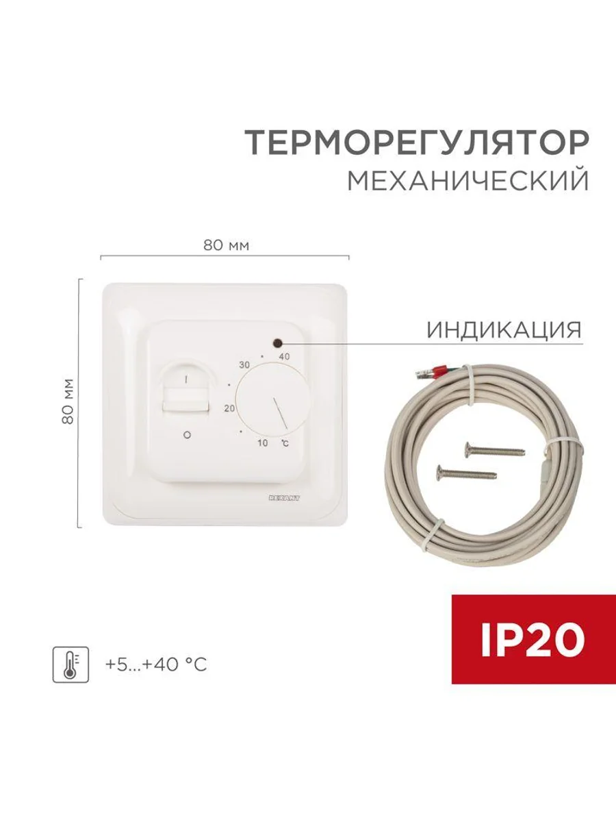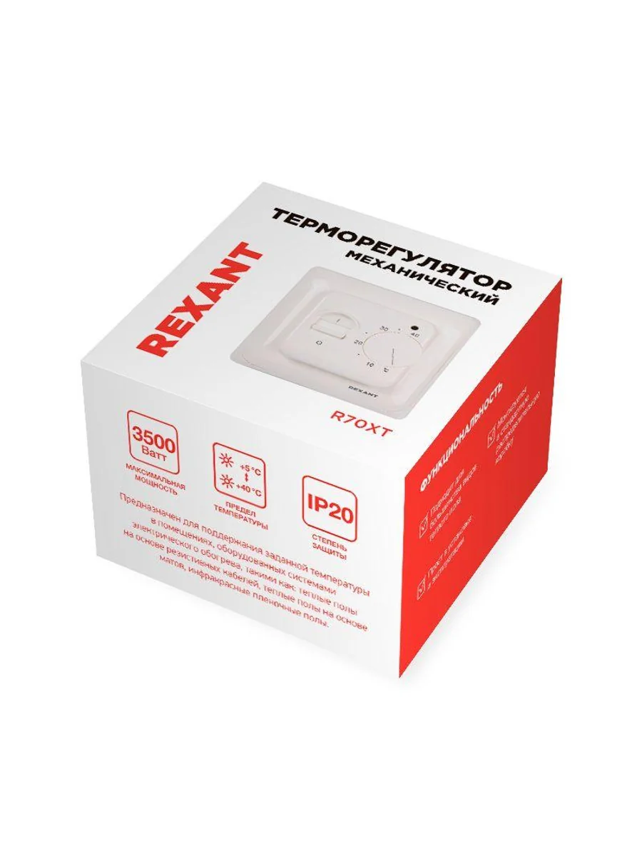 **Термостат механический R70XT от Rexant: надёжное управление температурой для вашего комфорта** Ищете эффективное решение для управления температурой в вашем доме или офисе? Механический термостат R70XT от Rexant — это надёжный и удобный инструмент, который поможет вам создать комфортные условия в любом помещении. **Преимущества термостата R70XT:** * **Универсальность:** термостат подходит для использования с различными электроприборами, что делает его универсальным решением для вашего дома. * **Высокая коммутационная способность:** контакты термостата выдерживают ток до 16 А (3500 Вт), что позволяет использовать его для управления большим количеством электроприборов. * **Точность контроля температуры:** наличие выносного датчика температуры на проводе (3 м) позволяет точно контролировать температуру в помещении и обеспечивать комфортные условия. * **Простота использования:** механический термостат легко настроить и использовать, что делает его доступным для широкого круга пользователей. **Применение термостата R70XT:** Термостат R70XT идеально подходит для использования с тёплыми полами, но также может быть использован с другими электроприборами, такими как обогреватели, кондиционеры и т. д. Это делает его универсальным решением для создания комфортных условий в любом помещении. **Ключевые характеристики термостата R70XT:** * **Диапазон регулирования температуры:** от +5 °C до +40 °C. * **Коммутационная способность контактов:** до 16 А (3500 Вт). * **Наличие выносного датчика температуры:** да, на проводе длиной 3 м. Не позволяйте температуре в вашем доме выходить из-под контроля. С механическим термостатом R70XT от Rexant вы сможете создать комфортные условия для жизни и работы, а также сэкономить на энергопотреблении. Приобретайте этот надёжный и универсальный термостат и наслаждайтесь комфортом в вашем доме!