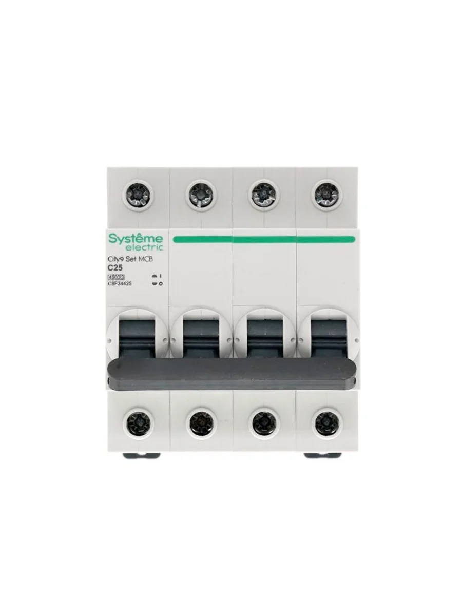 Автоматический выключатель серии City9 Set Systeme Electric, 4-полюсный, номинальный ток 25 А, характеристика С, Icn = 4.5 кА. Применяется в электрических сетях напряжением 400 В. Предназначен для защиты от перегрузок и токов короткого замыкания. Оснащен механизмом «мгновенной коммутации». Ударопрочный корпус из специального пластика с 6 металлическими заклепками. Безопасные клеммы исключают попадание кабелей в заклеммное пространство (ранее Schneider Electric EZ9F34425).