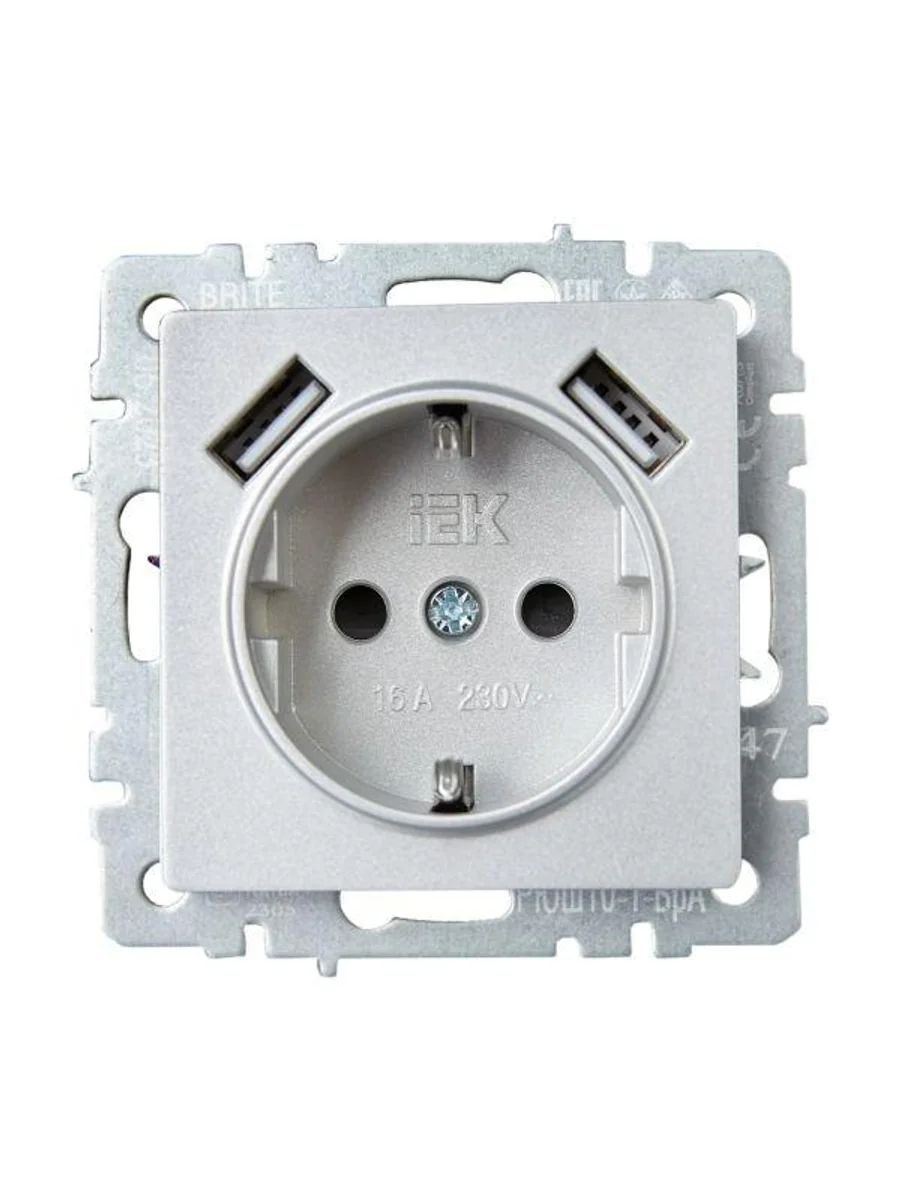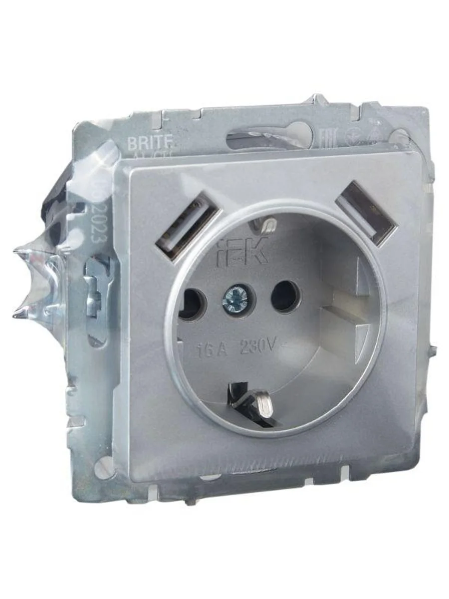 Розетка BRITE РЮш10-1-БрА 16А с USB A+A 2.1А с заземл. защ. шторки механизм алюм. IEK BR-R14-16-U21-D21-K47 | KeepBuilding