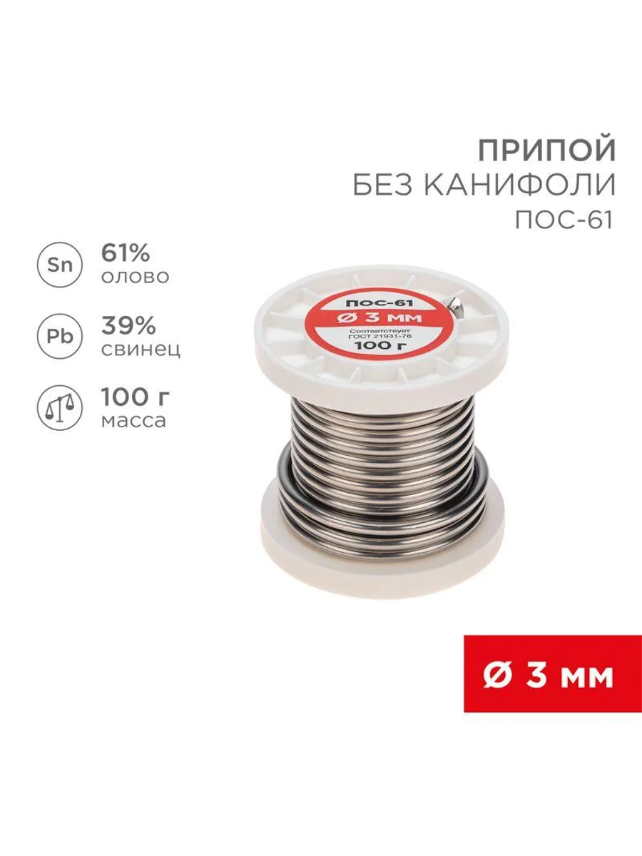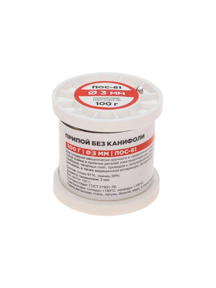 Припой ПОС-61 предназначен для пайки и лужения деталей электро- и радиоаппаратуры, точных приборов, печатных плат, медицинской техники. Особенно эффективен при работе с элементами, чувствительными к перегреву. Представляет собой проволоку (диаметром 3,0 мм) из сплава олова (60 %) и свинца (40 %). Как действует припой: нагреваясь до определенной температуры (183...190 °C) он расплавляется, смачивает спаиваемый металл, растекается по нему, заполняя место между соединяемыми деталями. Припой ПОС-61 обладает такими свойствами, как устойчивость к коррозии, создание механической прочности спаянного соединения, обладание удельной проводимостью (для токоведущих элементов). Основные характеристики: Диаметр припоя: 3,0 мм Состав: олово (60 %) и свинец (4 0%) Срок годности: бессрочно.