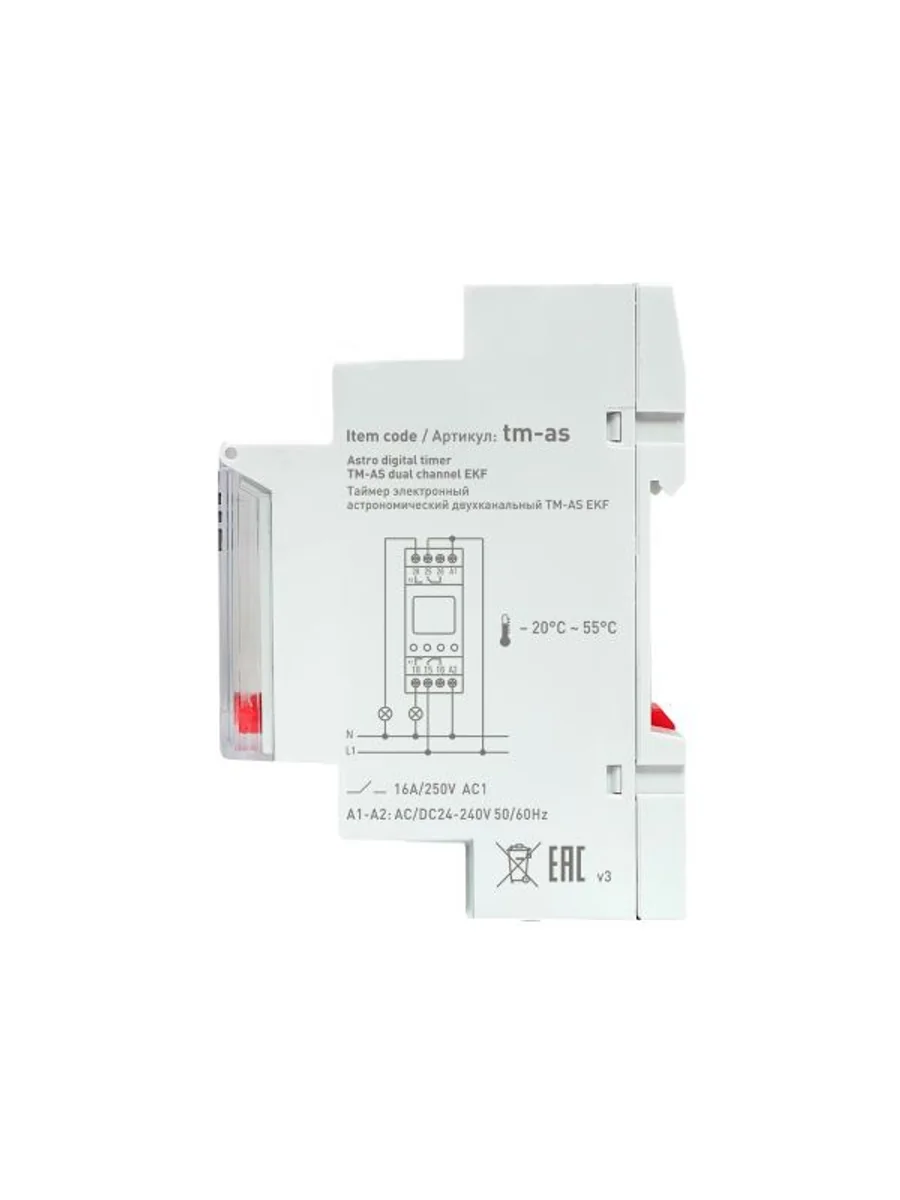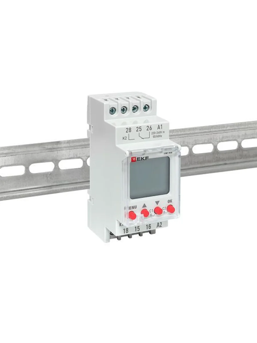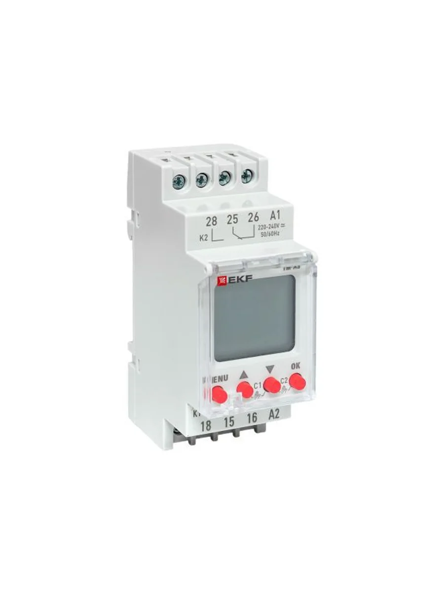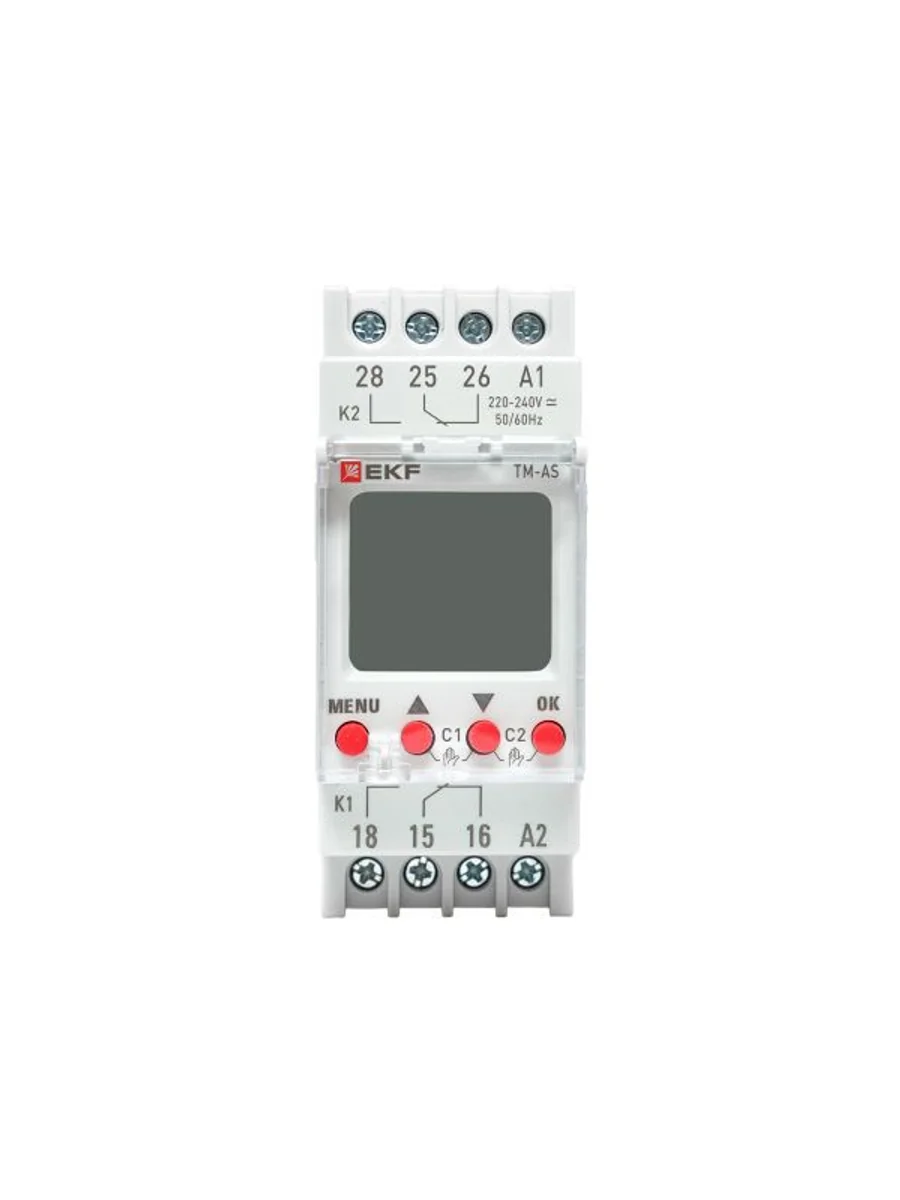 Таймер астрономический TM-AS EKF PROxima представляют собой реле с двумя независимыми группами контактов, момент срабатывания которого (включение/отключение) происходит по времени заката и восхода солнца на основании координат местоположения. Таймер имеет возможность срабатывания (80 программ) по заданному времени и дню недели. Таймер имеет в составе часы, что позволяет отслеживать текущее время. Изделие соответствует ГОСТ IEC 60947-1-2014, ГОСТ IEC 60947-5-1-2014. Преимущества: 1. Автоматический расчёт времени заката и рассвета 2. Два независимых канала управления 3. Задание до 80 программ 4. Информативный дисплей 5. Часы реального времени 6. Защитная крышка дисплея и кнопок с возможностью опломбировки 7. Возможность регулировки предустановки интервала времени 8. Возможность ручного управления реле по каждому канала 9. Два встроенных перекидных реле С/О с номинальным током 16А 10. Напряжение питания 24-264 V АС/DC