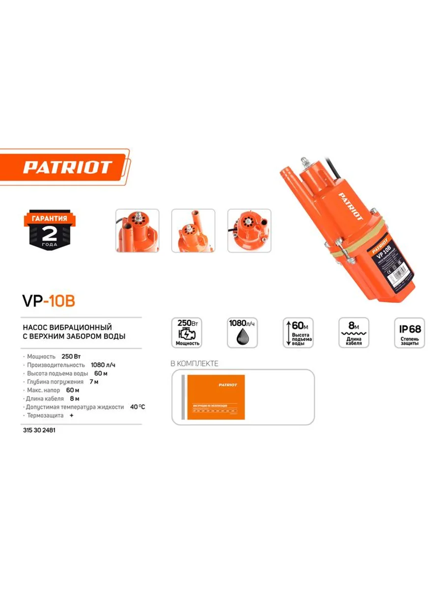 Насос погружной вибрационный VP 10В верхний забор 300Вт 18л/мин H-70м D-96мм термозащита PATRIOT 315302481 | KeepBuilding