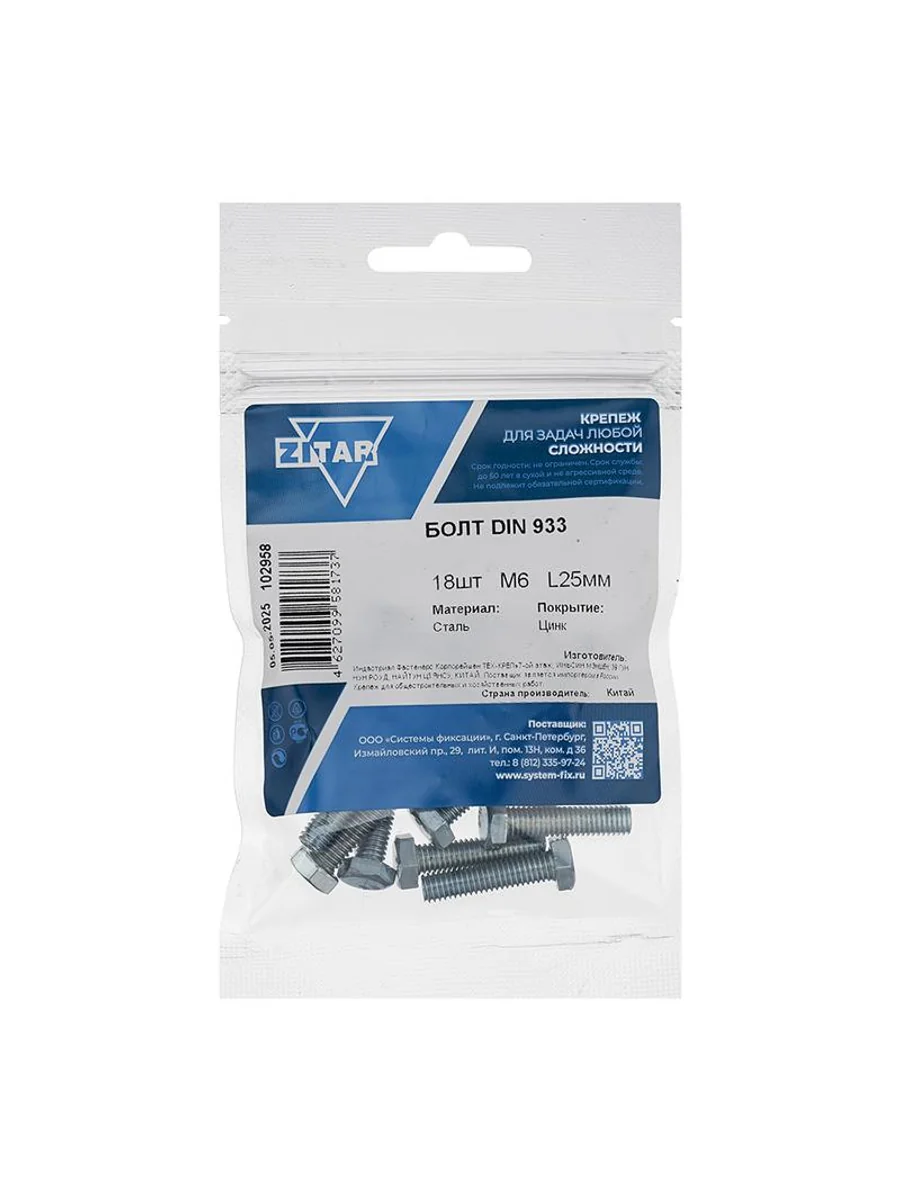 Болт с шестигранной головкой М6х25 DIN 933 класс прочн. 8.8 оцинк. (пакет) (уп.18шт) Tech-Krep/Zitar 102958