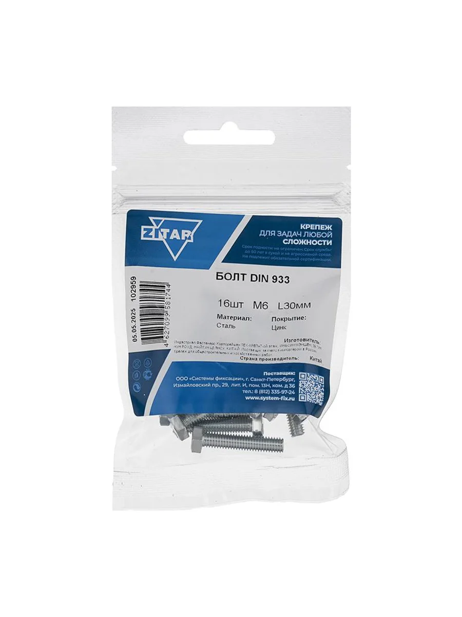Болт с шестигранной головкой М6х30 DIN 933 класс прочн. 8.8 оцинк. (пакет) (уп.16шт) Tech-Krep/Zitar 102959