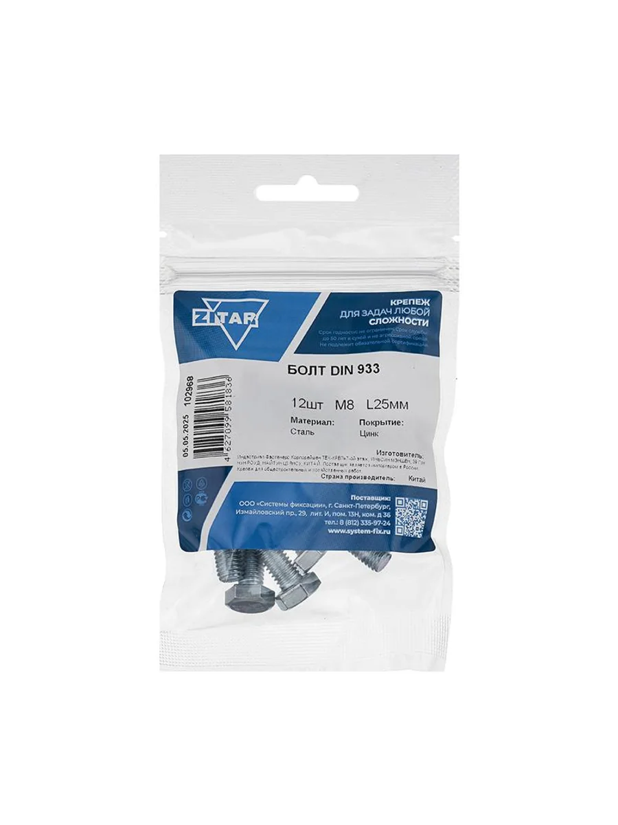 Болт с шестигранной головкой М8х25 DIN 933 класс прочн. 8.8 оцинк. (пакет) (уп.12шт) Tech-Krep/Zitar 102968
