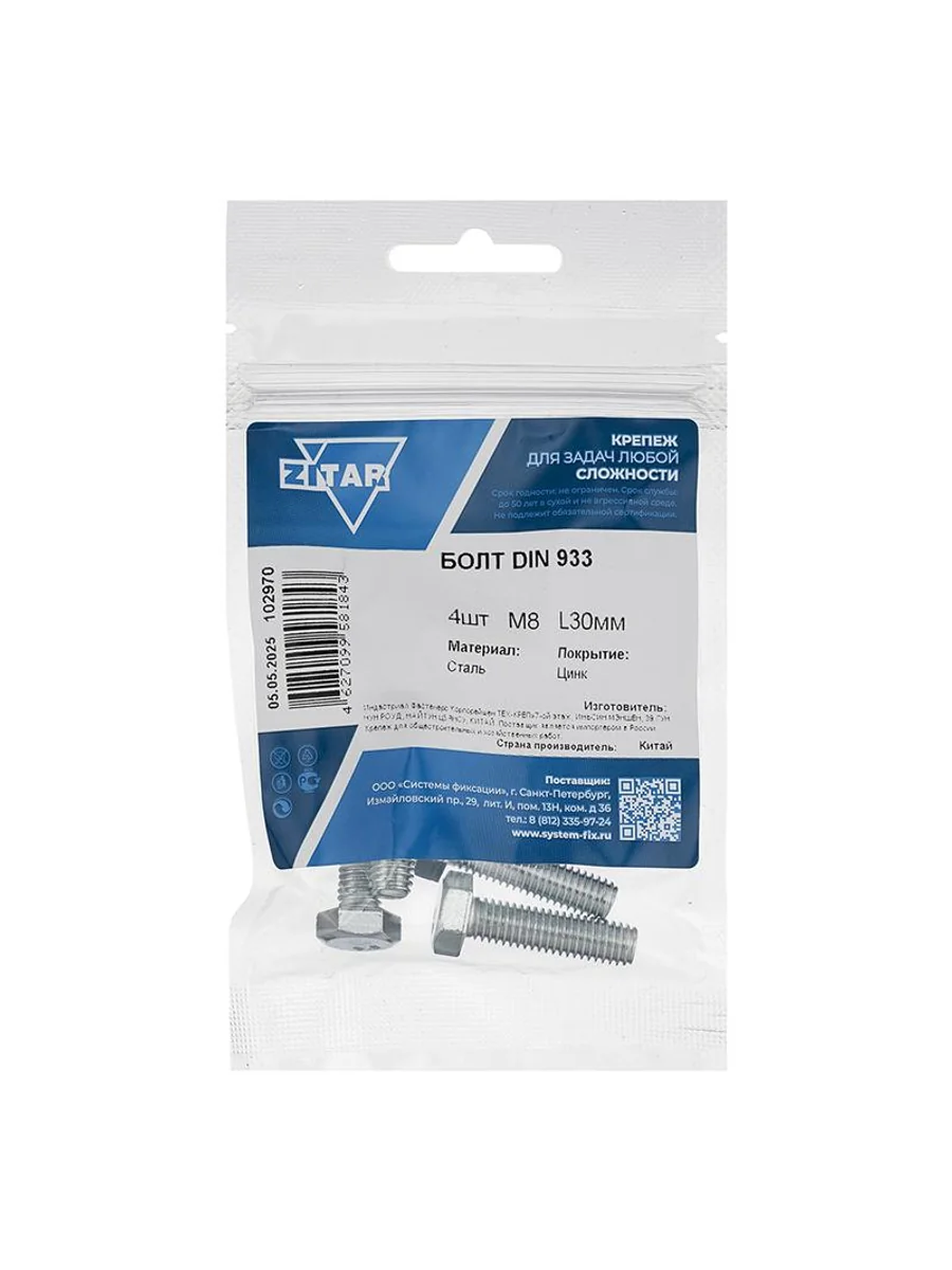 Болт с шестигранной головкой М8х30 DIN 933 кл. прочн. 8.8 оцинк. (пакет) (уп.4шт) Zitar 102970