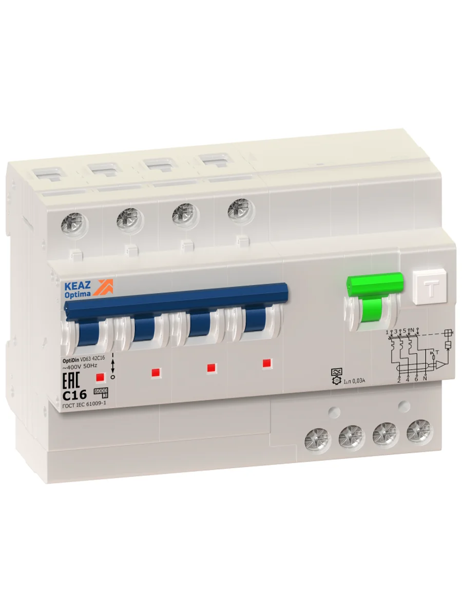 Выключатель автоматический дифференциального тока 4п C 16А 30мА тип A 6кА OptiDin VD63 УХЛ4 КЭАЗ 103476