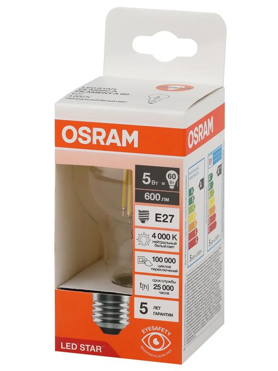 Светодиодные лампы OSRAM - разумная замена традиционным лампам накаливания или галогенным лампам. Светодиодные лампы OSRAM снижают затраты на освещение до 90% при сохранении привычного уровня освещенности. Эта лампа OSRAM серии LED Star выполнена в форме колбы A ("груша") с цоколем E27. Материал колбы - стекло, исполнение - прозрачное. Световой поток 600 люмен, что соответствует лампе накаливания на 60 Вт. Это филаментная лампа прекрасно выглядит, а потому идеально подходит для открытых светильников и декоративного освещения. Эта лампа излучает нейтральный белый свет, угол пучка - широкий. Качество света на высоте: низкие пульсации защищают глаза, а высокий индекс цветопередачи позволяет видеть мир в его истинном цвете. Кроме того, лампы OSRAM полностью безопасны для здоровья, поскольку в них нет опасных материалов по европейскому стандарту RoHS, а также они не производят вредных электромагнитных излучений, что подтверждено ЭМС (сертификат электромагнитной совместимости). Лампа проработает долго: срок службы - 25000 часов, 5 года гарантии. Светодиодные лампы OSRAM - умный выбор для здоровья семьи и кошелька!