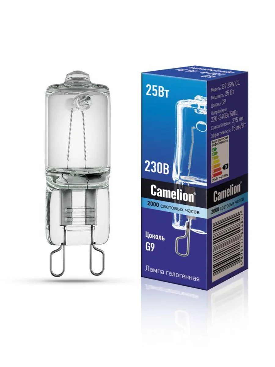 Лампа галогенная G9 25Вт 220В прозр. Camelion 5845 – лампа сетевого напряжения без отражателя, с прозрачной колбой, длиной 41 мм, с цоколем G9, мощностью 25 Вт. Цветовая температура 2850 К.