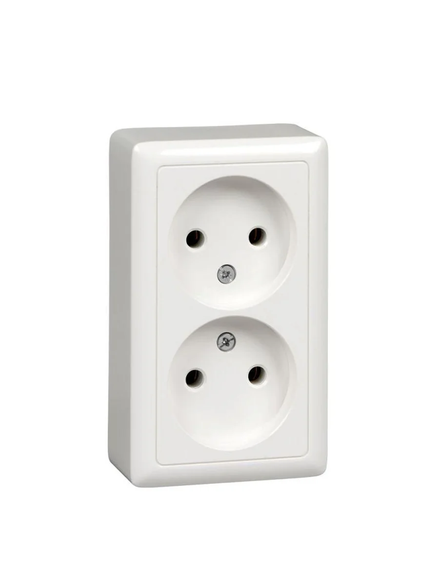 Розетка Systeme Electric (ранее Schneider Electric) ХИТ (открытой установки, цвет белый) двойная без заземления, без шторок, с изолирующей пластиковой пластиной предназначена для сетей до 250 В на ток до 16 А. Двойная розетка позволяет подключить два устройства в одном месте. Оптимальное соотношение цены и качества. Сделано в России.