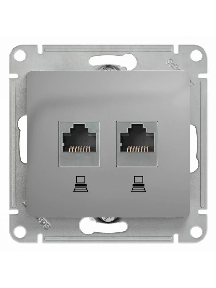 Механизм Systeme Electric серии Glossa (цвет алюминий) двойной розетки компьютерной с разъёмом RJ45 категория 5е предназначен для удобного и быстрого подключения вашего компьютера к компьютерной сети. - Выполнен из материала PС+ASA, стойкого к УФ-излучению и появлению царапин (ранее Schneider Electric MGU5.2020.30ZD).