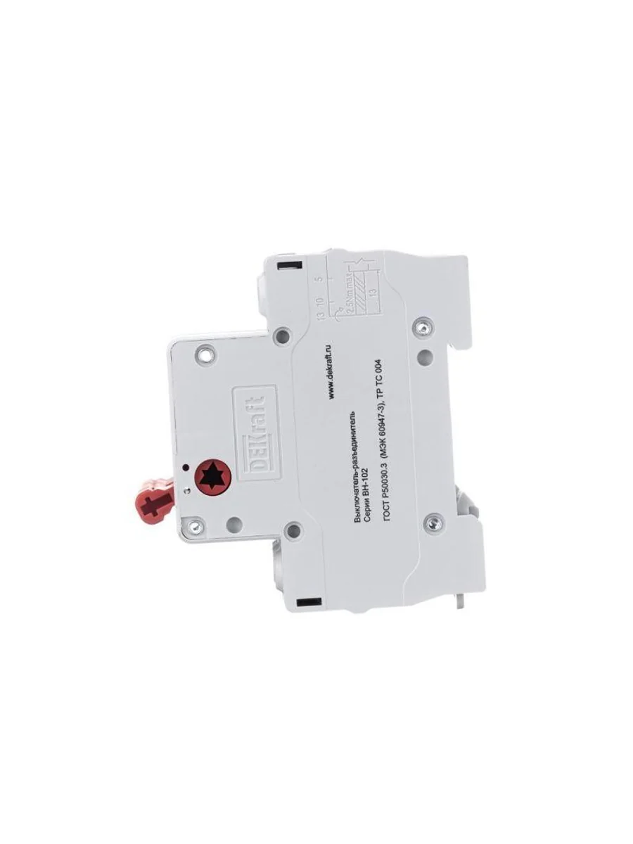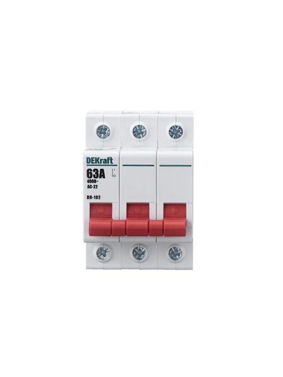 Выключатель-разъединитель серии ВН-102 Dekraft; 3P; номинальный ток 63 А; установка – на DIN-рейку; установочное положение - любое. Выключатели-разъединители применяются для ручного включения/отключения сетей напряжением до 400 В. Специальные мостиковые контакты обеспечивают надежный разрыв цепи; они полностью исключают возможность перекрытия дугой по изоляции. Усиленная рукоятка управления обеспечивает большое количество включений/отключений.