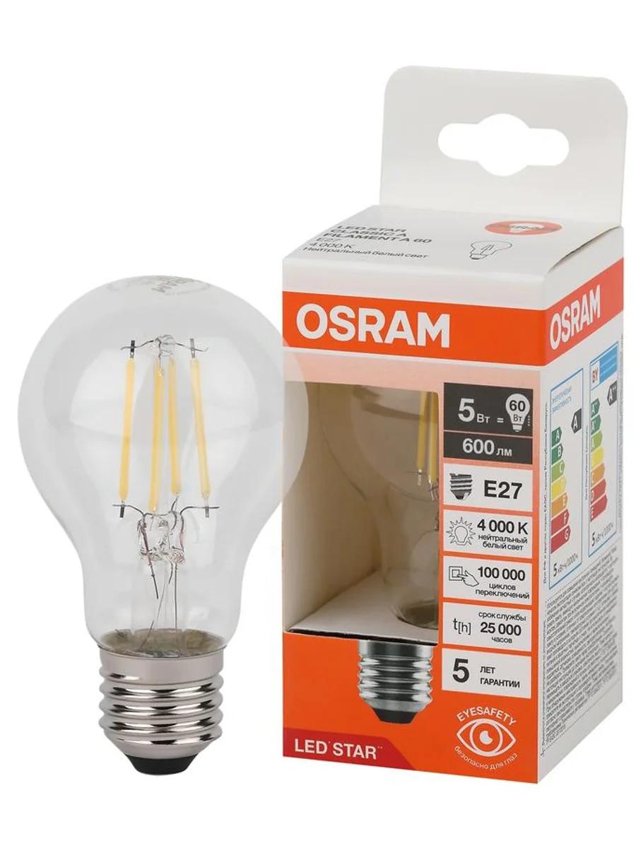 Лампа светодиодная филаментная LSCLA60 5W/840 230VFILCL 5Вт 4000К нейтр. бел. E27 600лм A угол пучка 300град. 220-240В (замена 60Вт) прозр. стекло OSRAM 4058075684034